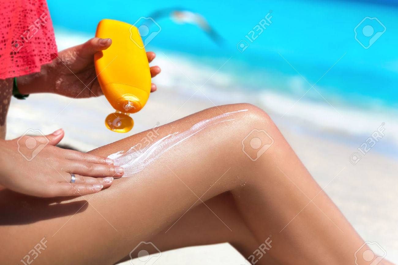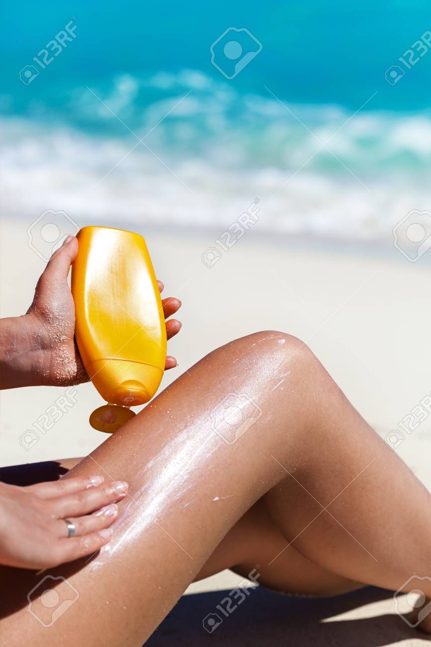 Tan Slim Woman Applying Sunscreen On Her Legs Sitting On Sandy Stock Photo Picture And Royalty Free Image Image 42843796 - New tanning lotions are in stock.